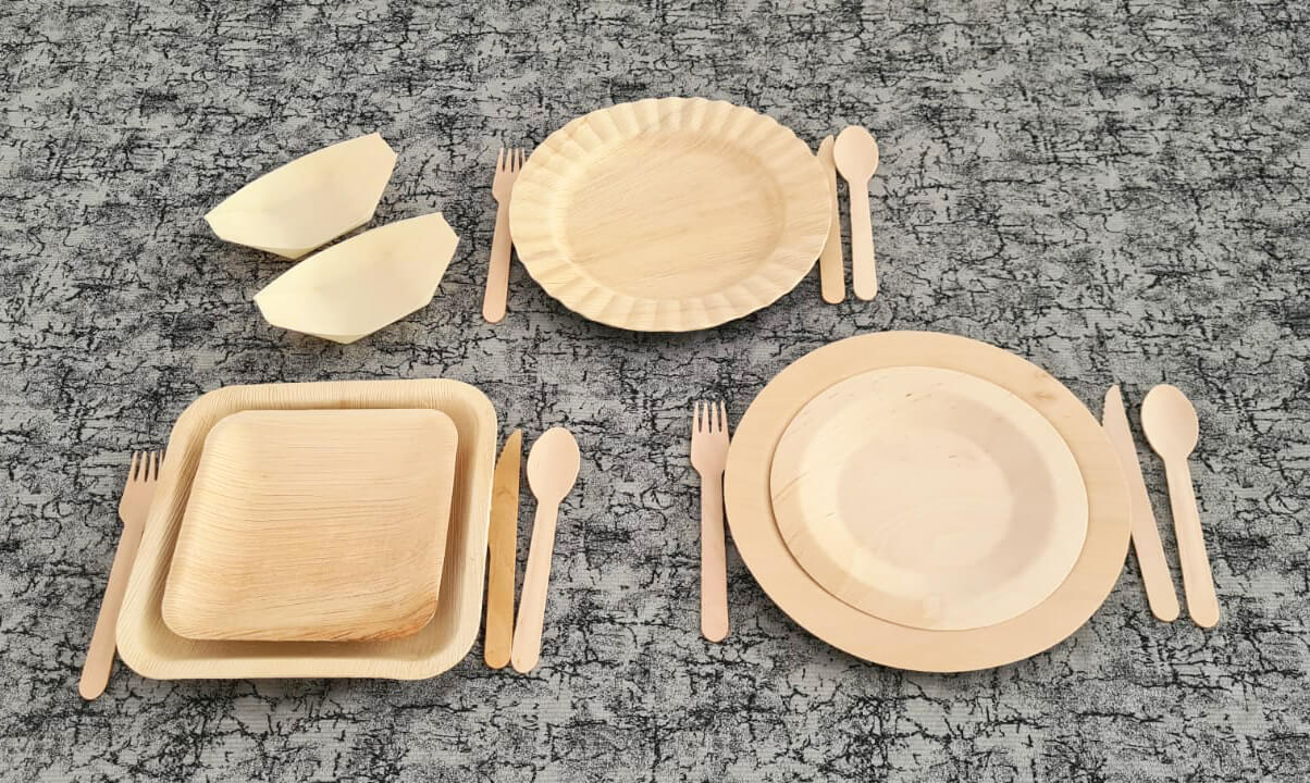 כלים מתכלים לשמירה על איכות הסביבה עשויים מעץ דקל או מעץ ליבנה ויוצרים תחושה של אווירה כפרית בעיצוב השולחן