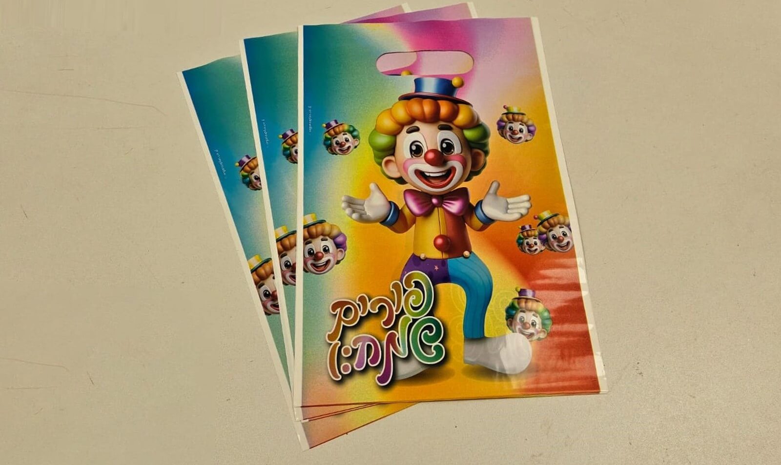מארז 20 יחי שקיות פורים שמח עם ידית מעוטר בליצנים גודל 20*30